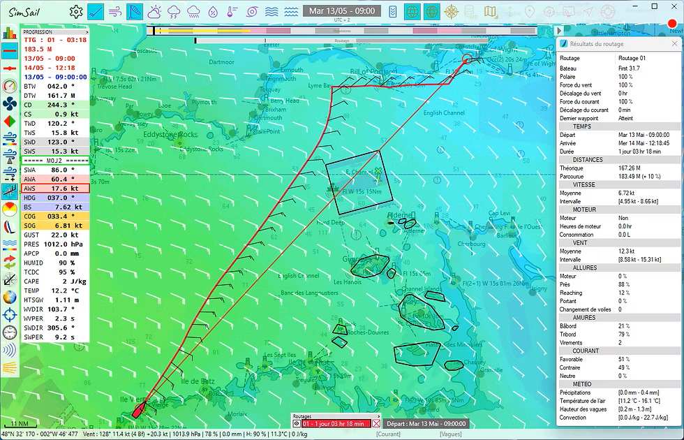 - Nombreux outils de visualisation du routage (conditions rencontrées par le bateau pour chaque pas de temps et statistiques globales du routage)